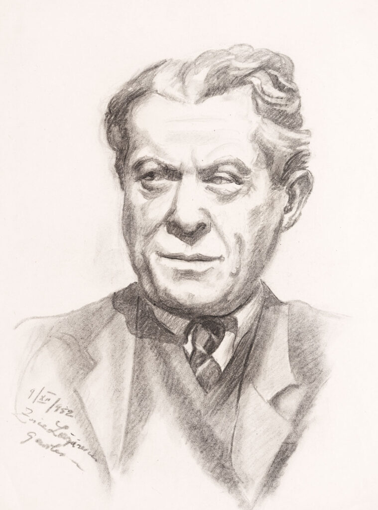 Cărbune pe hârtie; 46×66 cm; cca. 1952; Nr. inv. 3934 Compoziție pe orizontală reprezentând trei personaje din profil stânga, poziționate în perspectivă pe diagonala stânga-sus, dreapta-jos, așezate și desenând. În plan apropiat, în dreapta este un bărbat cu calviție accentuată purtând ochelari și cu pipa în gură, în planurile secundare două femei, cea din fundal poartă ochelari și batic