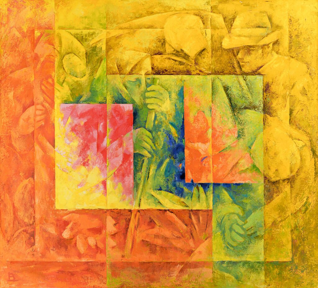 Ulei pe pânză; 141.7×127.7 cm; cca. 1969-1970; Nr. inv. 2019 Pe un fond galben și portocaliu se disting pătrate suprapuse de sub care transpar figurile unor țărani și țărănci.