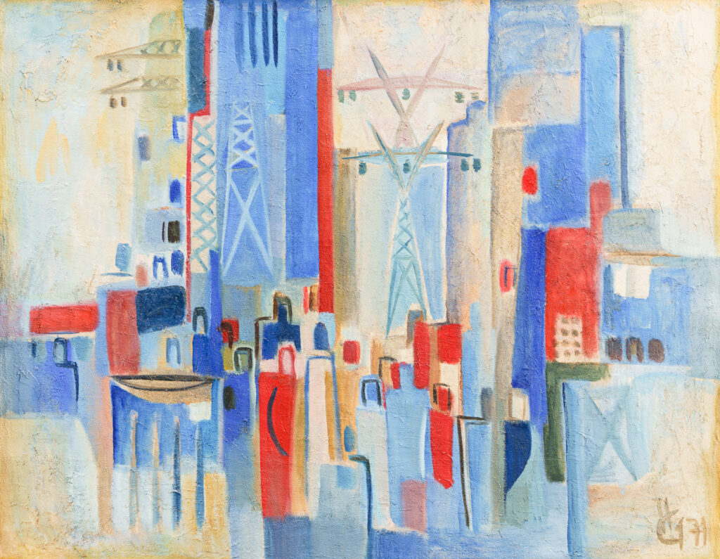 Ulei pe pânză; 146×130.4 cm; 1983; Nr. inv. 3454 Compoziție orizontală. Un peisaj industrial sugerat din forme geometrice albastre și gri.