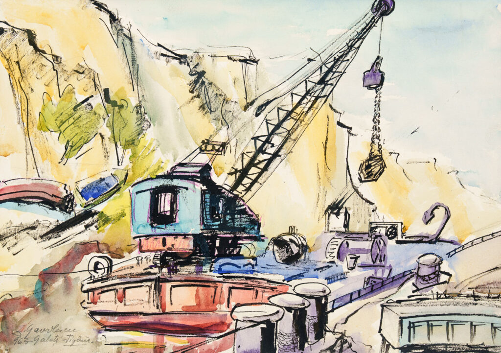 Acuarelă pe hârtie; 42×29.05 cm; 1963; Nr. inv. 1574 Compoziție orizontală reprezentând un peisaj industrial lângă un versant de piatră. Central este un utilaj tip macara ce are în vârf agățată o greutate.