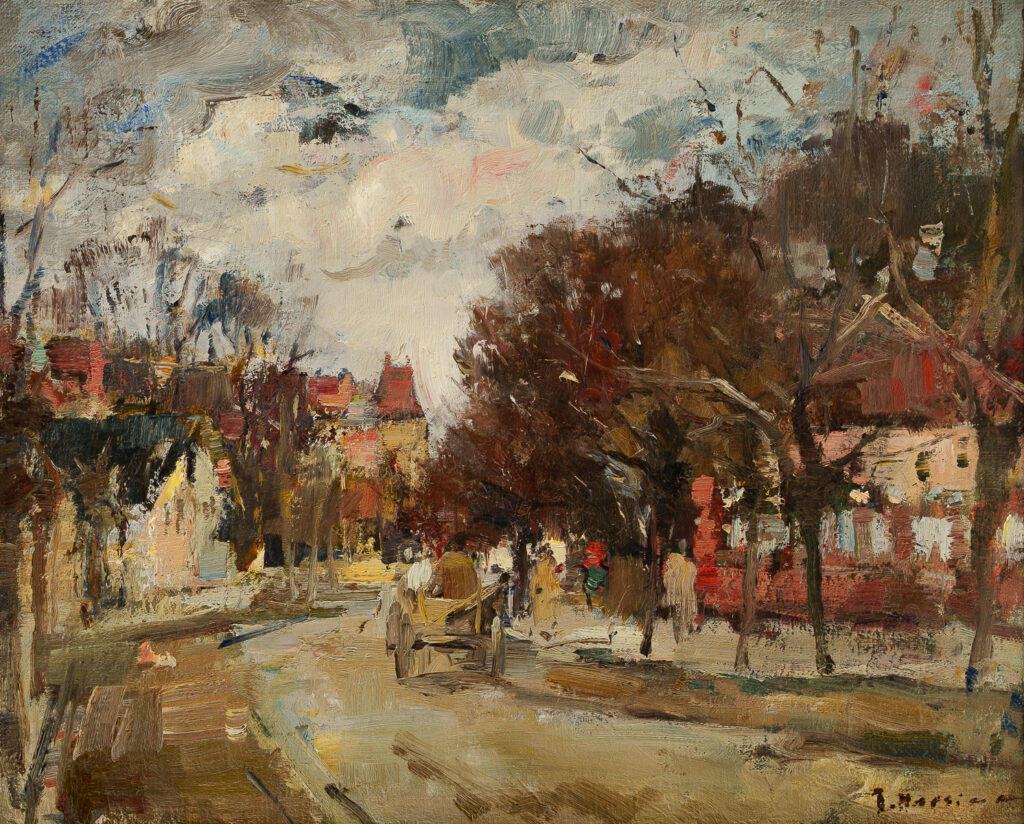 Ulei pe pânză; 52×42 cm; cca. 1960-1961; Nr. inv. 871 Compoziție orizontală. În prim plan o stradă cu o căruță, mărginită de copaci și case. În dreapta pe trotuar mai multe figuri.
