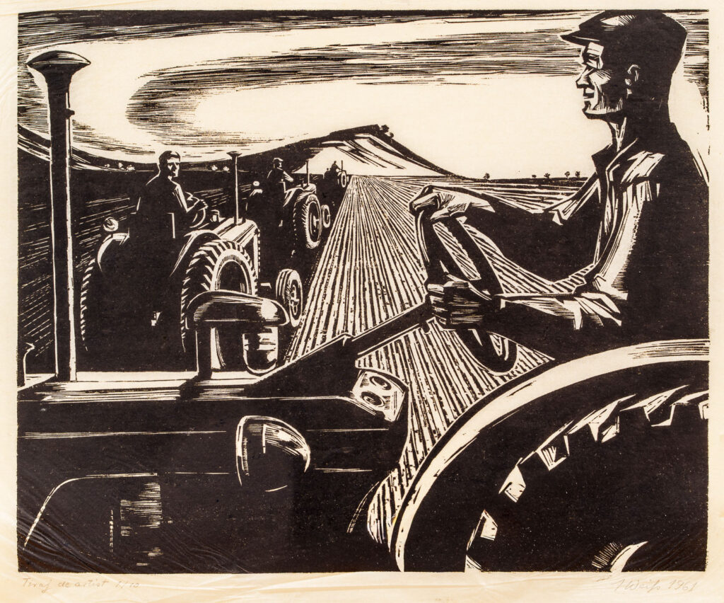 Lucrarea ilustrează „transformarea socialistă a agriculturii” prin mecanizare, sugerată de șirul de tractoare care se desfășoară din prim-plan către planul îndepărtat, devenind simboluri ale modernizării forțate promovate de propaganda regimului.
