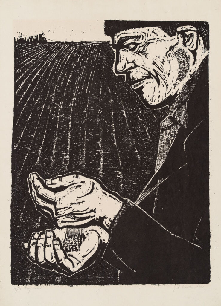 Figura unui țăran redat din profil, care privește gânditor semințele de grâu din căușul palmei din prim-plan, profilată pe fundalul unui ogor, simbolizează progresele agrotehnice atribuite „transformării socialiste a agriculturii” în urma colectivizării.