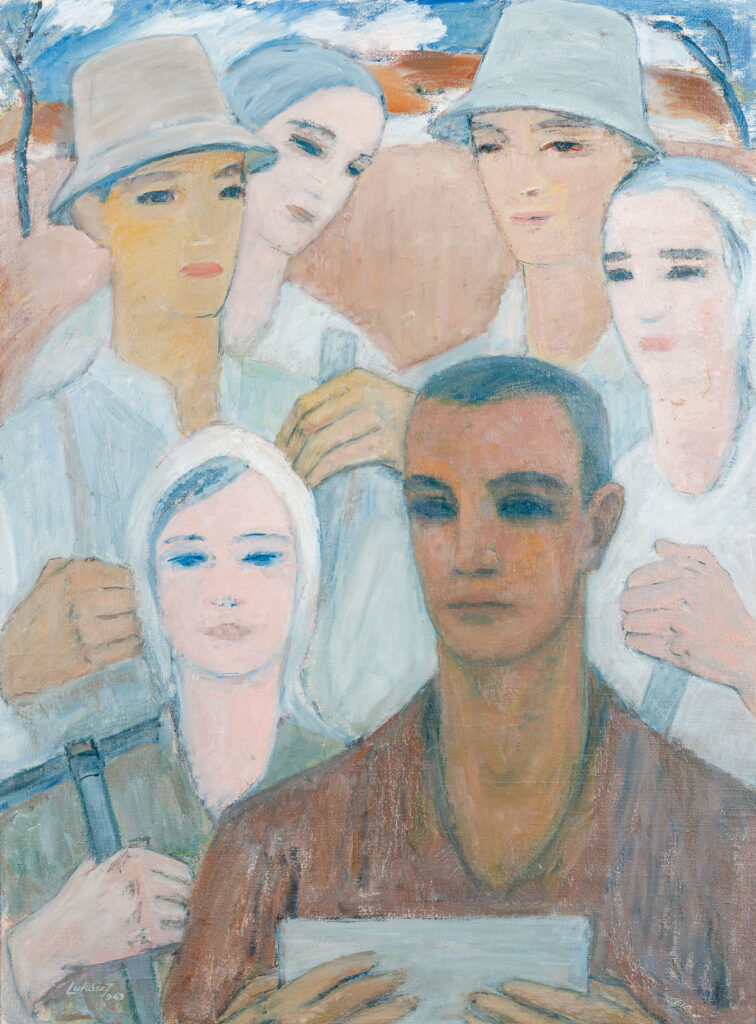 Lucrare reprezentativă pentru direcția falsului conformism, în care mesajul ideologic este sugerat discret. Tânărul țăran care domină compoziția, așezat pe mormanul de saci dintr-o căruță, nu indică explicit apartenența la colectivizare. Privitorul este condus subtil către această interpretare prin inscripția G.A.C. vizibilă pe saci, singurul element care trimite clar la contextul ideologic al epocii.