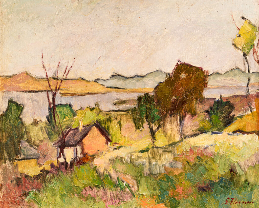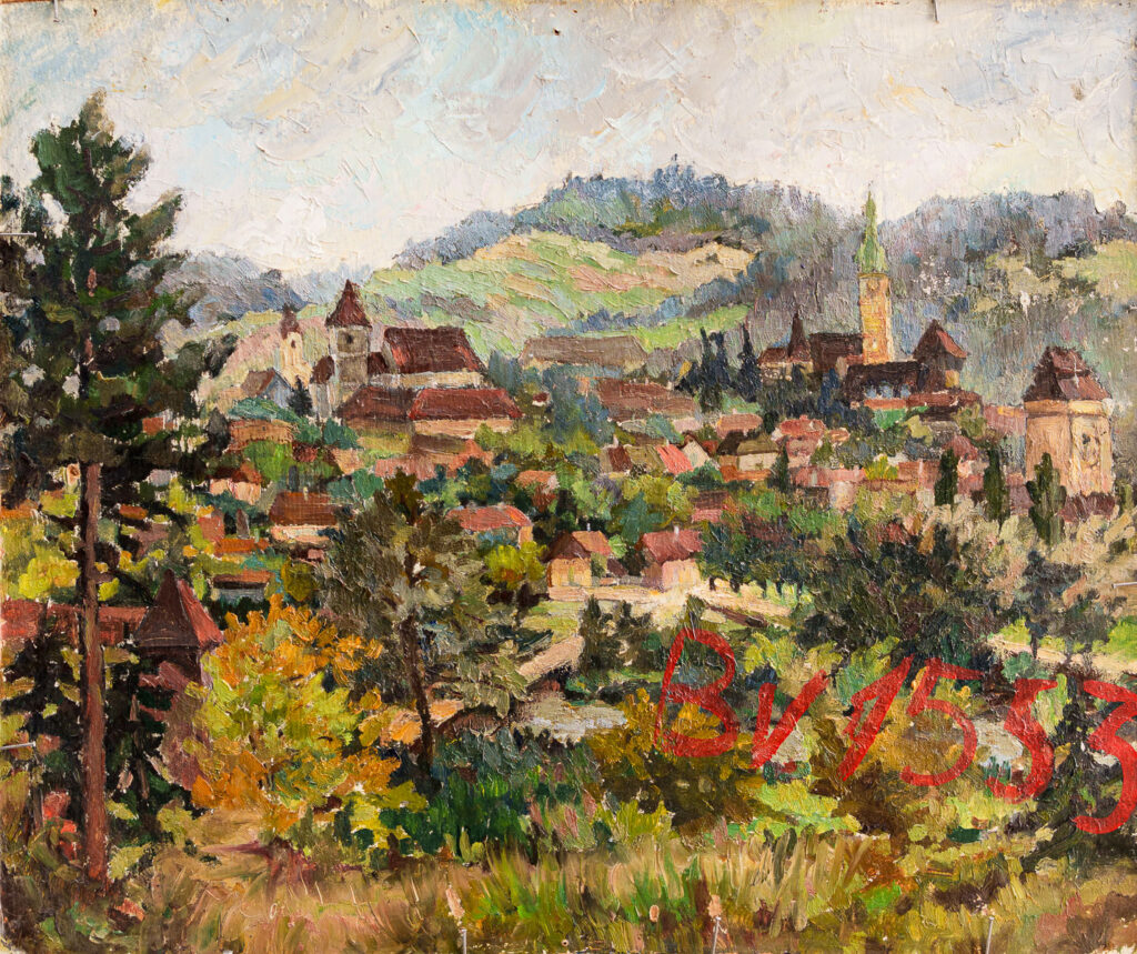 Probabil și din lipsă de materiale, dar și din dorința de avea mai multe prilejuri de exprimare, Gabriela Florescu a pictat ambele suprafețe ale aceluiași suport de carton. În fapt, avem astfel de-a face cu două lucrări ale aceleași artiste, realizate desigur pe același suport, însă doar o singură față a picturii a fost validată ca fiind reprezentativă. Cealaltă față, nevăzută până acum, fiind desconsiderată, chiar vandalizată prin notarea numărului de inventar al lucrării, scris invaziv cu roșu, lăbărțat pe suprafața picturii. Avem în cazul acesta, adăugată în lucrare, intervenția directă a persoanei care a trecut-o în inventar și care a considerat doar o față a picturii, cea semnată, ca fiind de reținut pentru posteritate. Lucrarea validată reprezintă un peisaj din Enisala, județul Tulcea, Dobrogea, în timp ce peisajul de pe verso, vandalizat este din Brașov. Ambele lucrări par realizate de artistă în plein air, deci cel mai probabil suportul cu peisajul din Enisala a călătorit împreună cu artista din Dobrogea în Brașov. Privind fața nevăzută a acestei picturi călătoare, putem completa nu doar un mic fragment din viața artistei, ci și compara atitudinea și expresia artistică a acesteia în relația cu peisajul dobrogean, dar și cu cel transilvănean, care la rândul lor pot reprezenta nu doar două destinații geografice ale artei românești, ci și două dimensiuni culturale ale luminii reflectate în arta românească.