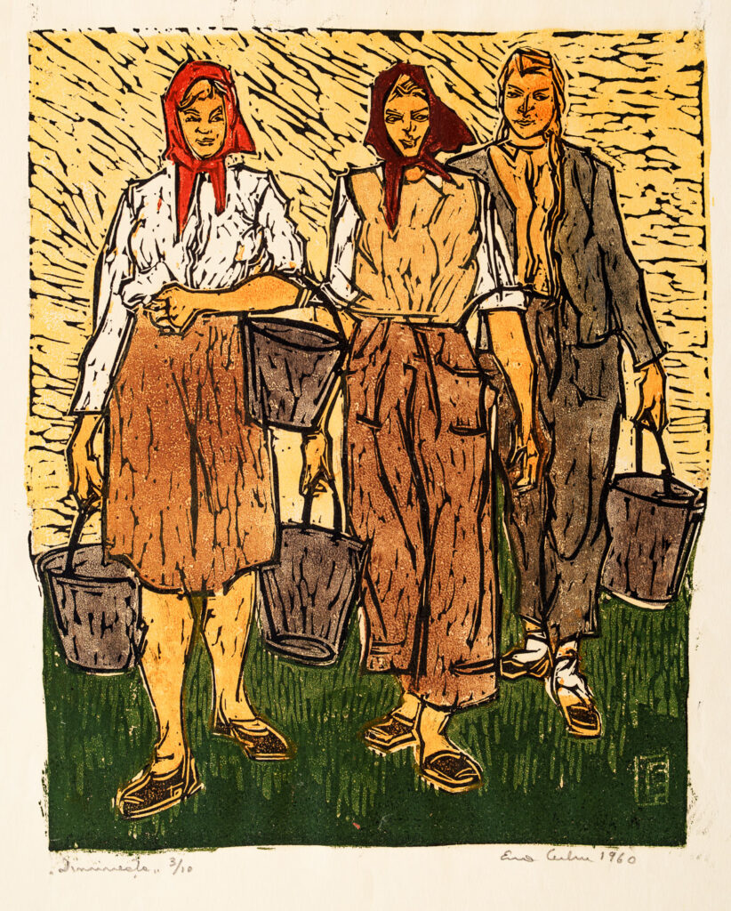 „Dimineața” este o linogravură creată din mai multe straturi de culoare, tipică realismului socialist al anilor ’60. Artista Eva Cerbu surprinde în această lucrare trei femei în mers, cu găleți în mâini, simbol al muncii colective și al solidarității rurale. Compoziția este frontală, monumentală, deși scena (cât și costumația) par desprinse din cotidian. Culorile pământii, pastelate, cu accente subtile de roșu în prim plan, subliniază energia și demnitatea personajelor. Femeile sunt anonime, creionate ferm în posturi de putere. Ele reprezintă idealul muncitorului nou, devotat progresului agricol al statului. Lucrarea „Dimineața” destinată multiplicării în scop propagandistic, sintetizează perfect limbajul vizual promovat de regimul Comunist. Un limbaj expresiv, creat din corpuri puternice, posturi sigure, sau cadre cineatice al unor noi începuturi. Dincolo de mesajul propagandistic, imaginea transmite o vitalitate sinceră și o forță feminină autentică ce depășește intenția ideologică de fond.