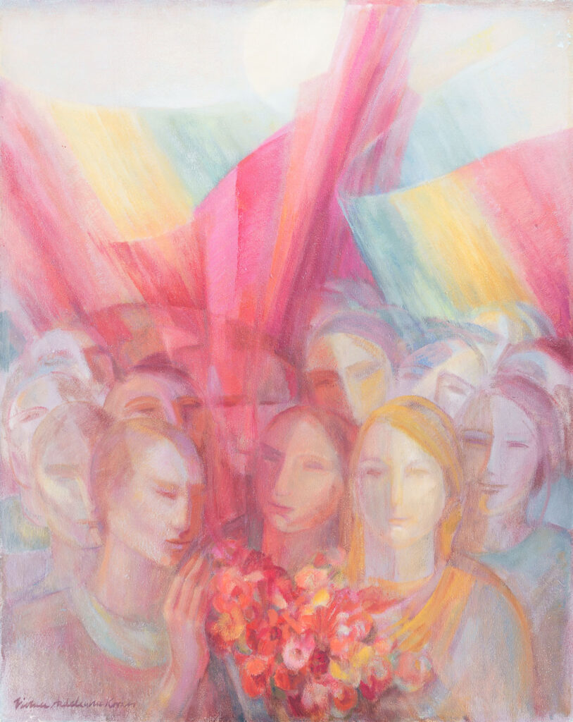 Compoziția lui Eftimie Modâlcă, prezentată în Expoziția semicentenarului PCR de la București din același an, cu titlul „Omagiu gloriosului Partid”1, a fost apreciată de critică pentru conținutul ideologic și estetic, condensând toate culorile propagandei comuniste. Artistul a ales, aparent surprinzător, o schemă compozițională inspirată evident de icoanele de tip prăznicar 2, cu o semnificație aparte în ortodoxie, realizând, mai mult decât o simplă ilustrare cu rol propagandistic, o translare de substanță mistică. În plus, păstrează și dominanta cromatică roșu/auriu specifică genului, creând o imagine-simbol pentru parcursul mișcării comuniste românești, o esență a noului cult. În centru este plasată imaginea-teofanie a partidului etern, înconjurată de 12 scene cu relevanță pentru istoria PCR, printre care regăsim și câteva cu femei, condiția lor în noua lume fiind un subiect care mă preocupă. Una dintre aceste secvențe surprinde, într-o ipostază triumfătoare, un cuplu braț la braț, sugerând egalitatea de gen obținută grație partidului; o alta, cu țărănci, simbolizează lumea rurală ridicată de comunism din lipsuri și primitivism.