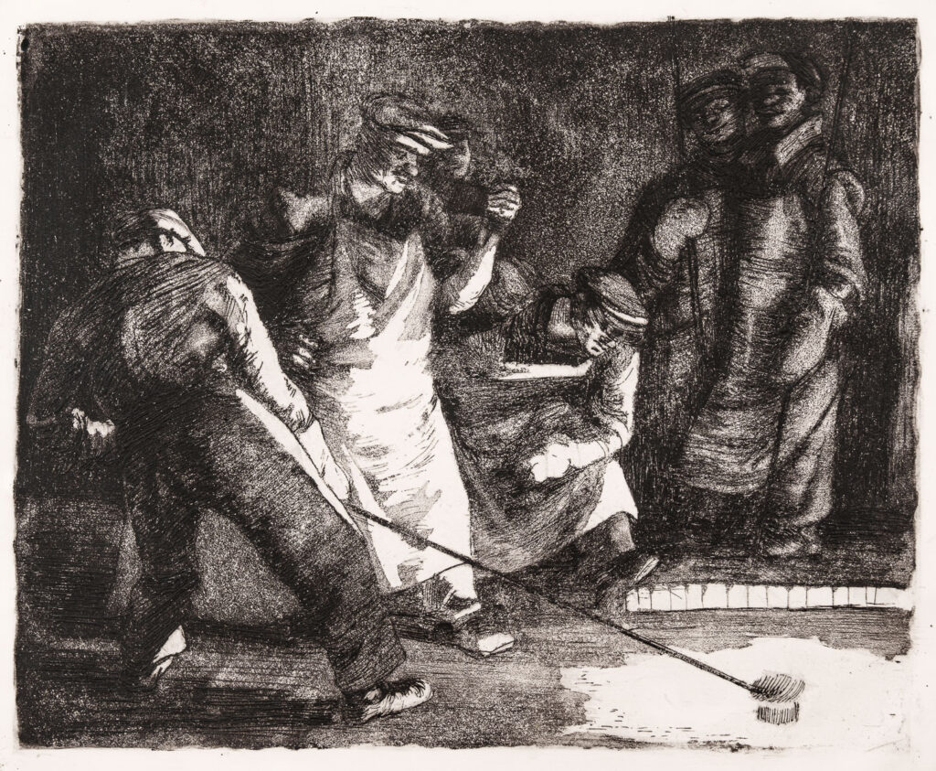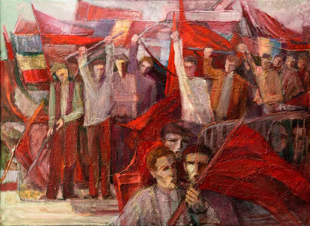 Doi mineri citesc „Scînteia” la lumina lămpașului. Contrastul între pagina luminoasă a ziarului și întunericul din jur atrage atenția asupra textului scris, asupra ziarului ca simbol al autorității și al adevărului impus. Paleta de culori închise – brun, ocru, cenușiu – și tușele groase de pensulă creează o atmosferă gravă, încărcată, aproape ritualică. Chiar dacă chipurile celor doi muncitori nu sînt clar definite, le putem citi deferența și umilința din privire. Dar e și ceva ambiguu în expresia lor, ceva greu de definit, situat între solemnitate și neliniște. Lumina care cade pe prima pagină a ziarului și umbrele care ascund fețele sugerează nu doar puterea propagandei, ci și o tensiune între individ și autoritate, între convingere și constrîngere. Sau mă înșel?