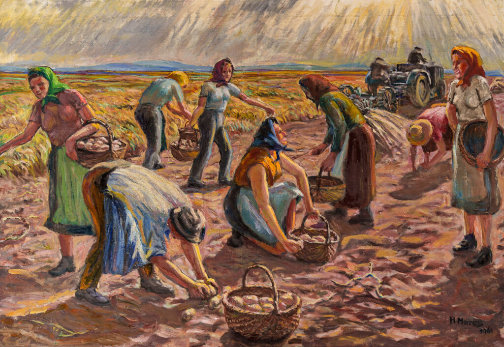 Am selectat această lucrare prin prisma activităţii pe care pictura o redă, şi anume o masă de femei cu trăsături indefinite, cu chipurile mereu ferite de privirea artistei, femei îmbrăcate cât mai simplu, de cele mai multe ori în costume tradiţionale. Această tematică a muncii la câmp, realizată de femei care pot fi oricare dintre doamnele din perioada comunistă care şi-au pierdut chipul, vocea prin procesul de sovietizare a artei şi a subiectelor impuse de sistemul politic. Posibilele pierderi ale vocii, ale chipului, ale identităţii prin prisma noilor ideologii de dreapta contemporane reinterpretate, care inundă spaţiul online şi offline constant, m-au determinat şi mai mult să selectez această lucrare. Teama de un sistem politic care aduce limitări, aşa cum a fost şi cea din perioada comunistă, a fost înlocuită în artă de o împlinire prin muncă, şi anume prin munca văzută ca o datorie faţă de sistem, faţă de un trecut istoric (re)gândit. Colectivistele redate de Micaela Eleutheriade nu erau doar femeile care pliveau, ci erau idealurile sociale pe care sistemul politic le dorea de la femei: de a fi muncitoare fără o identitate proprie, mereu îmbrăcate corespunzător, modeste şi mulţumite cu ce le oferea statul.