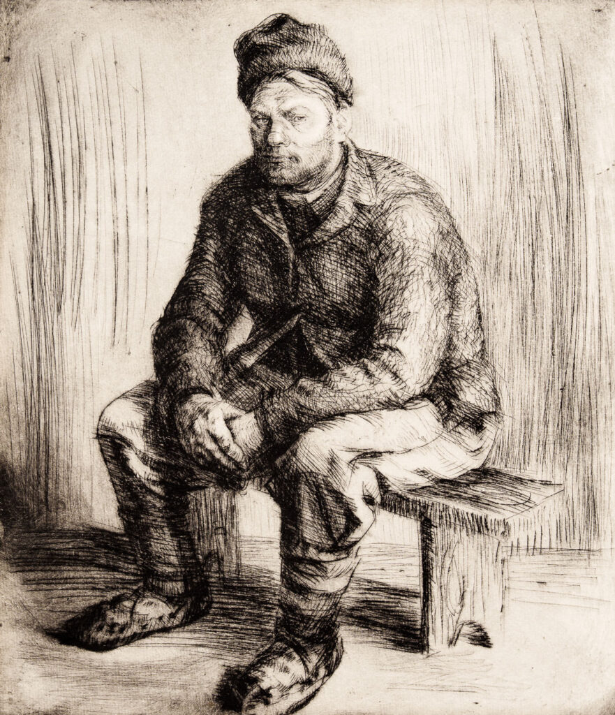 Realizat într-o tehnică dificilă, care necesită rigoare, cu o compoziție simplă și puține elemente, studiul Corinei Beiu Angheluță reușește să fie tulburător, să treacă dincolo de retină. Portretul țăranului – odihnindu-se pe o bancă de lemn, într-o postură firească – are o forță expresivă surprinzătoare, care ne reține privirea și provoacă întrebări – ce este acest sentiment pe care îl observăm pe chipul său? Este oboseală, revoltă, încrâncenare, îngrijorare? Sau poate doar a căzut pe gânduri? Privim chipul, mâinile, trecem apoi la picioarele încălțate în opinci, așezate liniștit și ferm, observăm interiorul modest, sumar descris, și ne întoarcem din nou la chip, pe care îl scrutăm încercând să ghicim, să înțelegem. Cu o stăpânire impecabilă a mediului în care lucrează, printr-o hașură variată, prin linii mărunte și ample, nervoase și ferme, Corina Beiu Angheluță construiește un portret psihologic pătrunzător, care își păstrează relevanța, în ciuda aparenței sale inactualități.