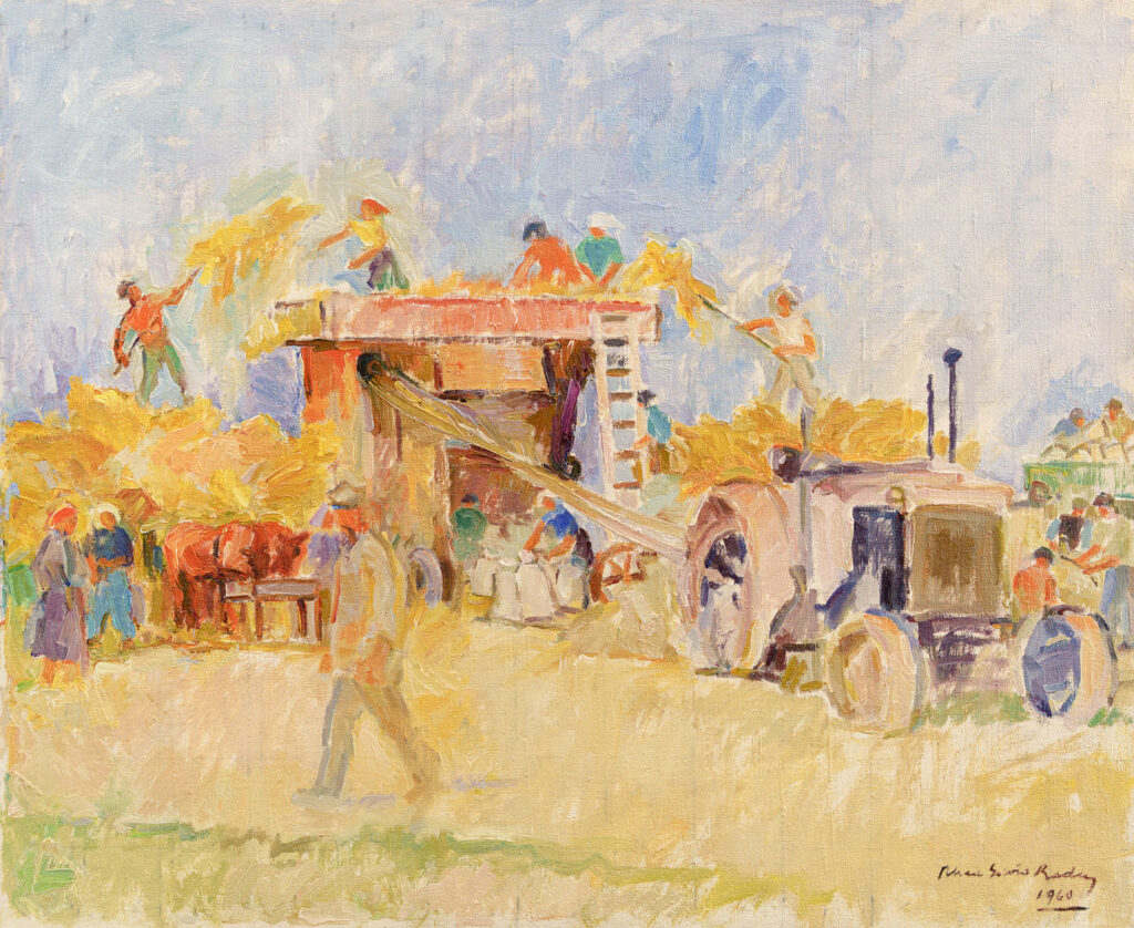 Sunt mereu fascinat de modul cum varietatea stilistică interbelică a trecut prin furcile caudine ale realismului socialist. De exemplu, sudorii, forjorii, muncitorii impuși tematic de schema de creație apar în anii 50, la Maxy sau la alți avangardiști convertiți, cu linii și volume constructiviste, dintr-o estetică străină puterii, trădând-o în folosul artei. Privesc acum „Treierișul”, din 1960, al Rheei Silvia Radu. Scenele de muncă rurale – arat, seceriș, cosit, etc. – sunt prezente sistematic în inventarul tematic dintre cele două războaie și trec cu ușurință în breviarul propagandistic al puterii populare. Numai că personajele nu mai aveau voie să fie triste sau obidite, iar atmosfera trebuia să fie mai degrabă festivă, fiindcă în noua societate comunistă omul nu putea fi decât fericit. Într-adevăr, lucrarea de față degajă o bucurie a muncii, dinamism, gesturi ample, într-o atmosferă cu tonuri calde. Lumina e solară, difuză, vibrând în tușe scurte și spontane, sugerând ritm colectiv și sărbătoare. Cu toate acestea, tratamentul cromatic și expresivitatea liberă depășesc rigiditatea propagandistică — lucrarea transmite bucuria și energia umană a muncii, nu o schemă ideologică. Tehnica ne amintește mai degrabă de impresionismul târziu decât de realismul socialist, având de-a face cu o nouă trădare a propagandei în favoarea artei. Lucrarea este în același timp un document social interesant. În centru avem o batoză Malaxa, așa cum o regăsim în diferite lucrări, la Rudolf Schweitzer-Cumpăna, Dumitru Ghiață sau la Constion. Dar dacă la aceștia este înconjurată în principal de oameni și animale, la Rhea Silvia Radu apare tractorul, simbol al modernizării muncii rurale. Sigur, în acel moment, Fabrica Malaxa deja se numea Uzinele „23 August”, iar fosta Fabrică de avioane din Brașov devenise Uzina Tractorul – ceea ce face ca primul tractor scos pe piață în 1946 să aibă nume de avion, IAR 22. După cum se vede, relația dintre trecutul burghez și prezentul socialist al epocii, fie că vorbim de artă sau de tehnică, se dovedește mereu complicată și problematică.