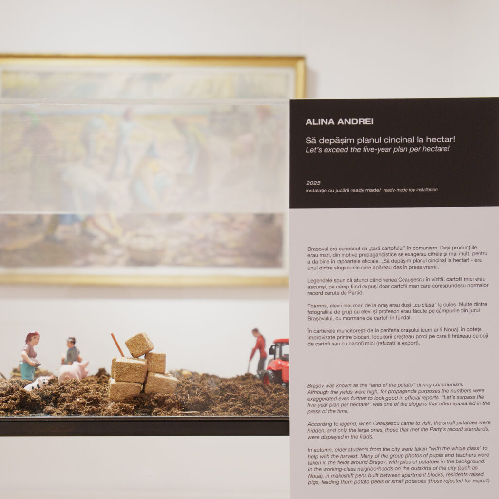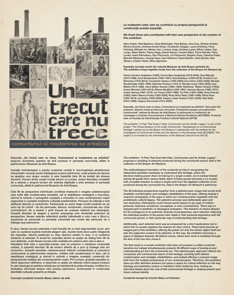 Expoziţia „Un trecut care nu trece. Comunismul și moștenirea sa artistică” propune revizitarea operelor de artă produse în perioada comunistă, aflate în patrimoniului Muzeului de Artă Brașov. Inovația metodologică a actului curatorial constă în recunoașterea pluralismului interpretativ necesar pentru înțelegerea acestui patrimoniu, unde puterea de decizie nu aparține unui singur curator, ci este împărțită între 32 de invitați din diverse domenii. Fiecare dintre acești invitați devine co-curator, având libertatea completă de a selecta o singură lucrare din colecția digitizată a artei produse în perioada comunistă, aflată în patrimoniul Muzeului de Artă Brașov. Cele 32 de perspective individuale constituie împreună o imagine caleidoscopică care evită atât condamnarea simplistă, cât și reabilitarea nostalgică a trecutului, oferind în schimb o cartografie nuanțată a modurilor în care contemporanii noștri negociază cu această moștenire culturală problematică. Procesul de selecție a fost deliberat deschis și nerestrictiv. Participanții au putut alege lucrări bazându-se pe orice tip de criterii – fie ele personale, istorice, emoționale, conceptuale sau chiar contradictorii. Nu a existat o grilă impusă de evaluare estetică sau ideologică. Această libertate de alegere a permis emergența unei diversități autentice de perspective, fiecare selecție reflectând poziția individuală a celui care a făcut-o, experiența sa personală cu perioada comunistă sau modul său particular de a înțelege acel patrimoniu. În plus, fiecare lucrare selectată a fost însoțită de un text argumentativ scurt, prin care co-curatorul explică motivele alegerii sale. Aceste texte devin parte integrantă din expoziție, oferind publicului nu doar obiectul artistic în sine, ci și contextul subiectiv al selecției. În acest fel, expoziția devine un spațiu de dialog între 32 de voci distincte, unde fiecare lucrare este mediată prin prisma celui care a ales-o. Rezultatul final este o expoziție-mozaic care nu propune o narațiune curatorială unitară, ci prezintă simultan 32 de moduri diferite de a privi și înțelege arta din comunism. Această abordare caleidoscopică reflectă complexitatea și caracterul controversat al patrimoniului respectiv, evitând atât condamnarea în bloc, cât și reabilitarea nostalgică, și oferind în schimb o imagine nuanțată, construită din perspectivele multiple ale contemporanilor noștri. Prin urmare, această expoziție nu oferă răspunsuri definitive, ci deschide un spațiu de reflecție critică asupra modului în care ideologia și estetica rezistă sau se transformă la proba timpului, invitând la o dezbatere informată despre rolul acestui patrimoniu controversat în construcția identității culturale prezente și viitoare.
