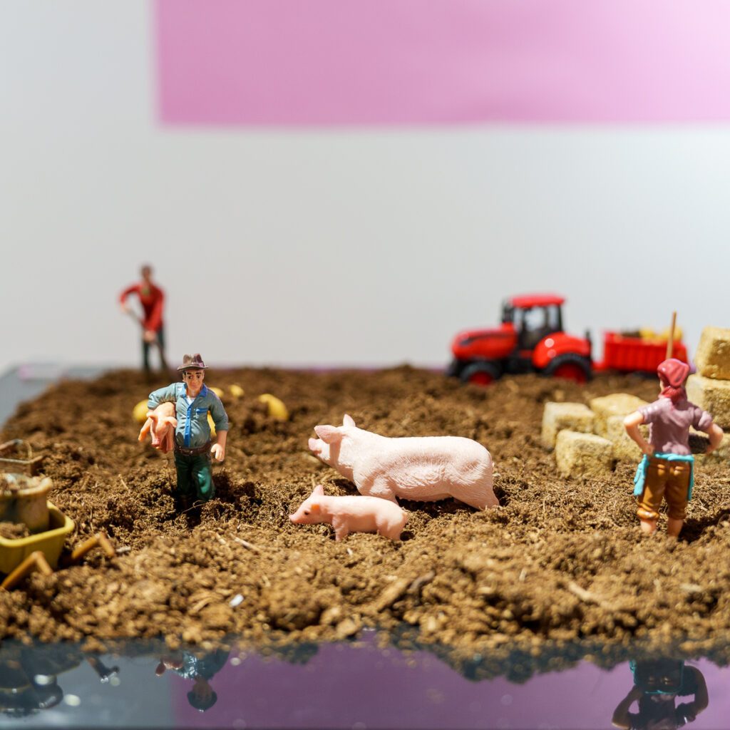 Simbolul secerii și ciocanului a apărut imediat după Revoluția Bolșevică (1917), și a fost stema Uniunii Sovietice. Cu timpul, simbolul a fost preluat de toate partidele comuniste din lume, inclusiv în România. Secera și ciocanul aurii, încrucișate, simbolizau uniunea dintre muncitori și țărani. Cum această uniune era falsă, am dezmembrat stema – am dezlipit elementele principale. Le-am transformat, tot simbolic, în două piniate, obiecte decorative folosite la petreceri şi lipsite de orice putere doctrinară politică. Le-am umplut cu chipsuri din creveți vietnamezi pentru că o lungă perioadă de timp doar aşa ceva se găsea în magazinele alimentare din Braşov şi toată țara (poate şi borcane cu ghiveci de legume). La origine, în mai multe culturi, spargerea piniatei şi eliberarea de ofrande din aceasta reprezentau un simbol al înfrângerii răului, precum şi invocarea divinității pentru atragerea unei perioade de belșug.