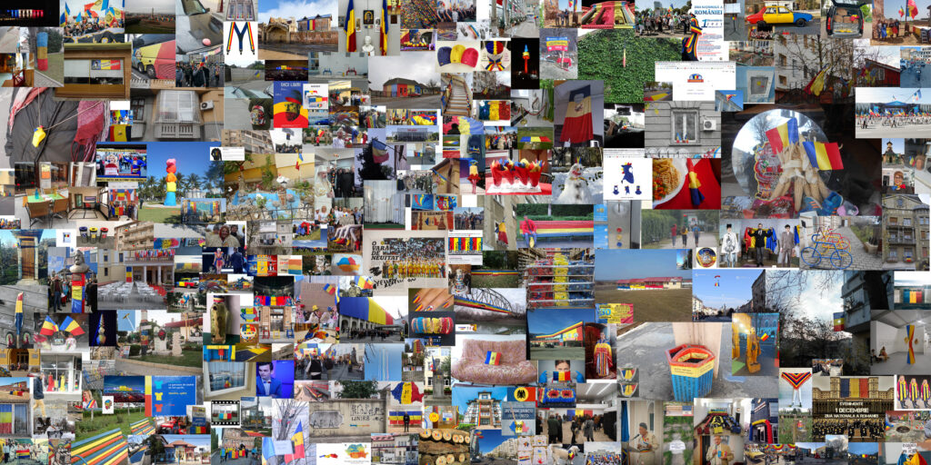 Prin colaje de fotografii, artistul documentează prezența și trivializarea unor simboluri.