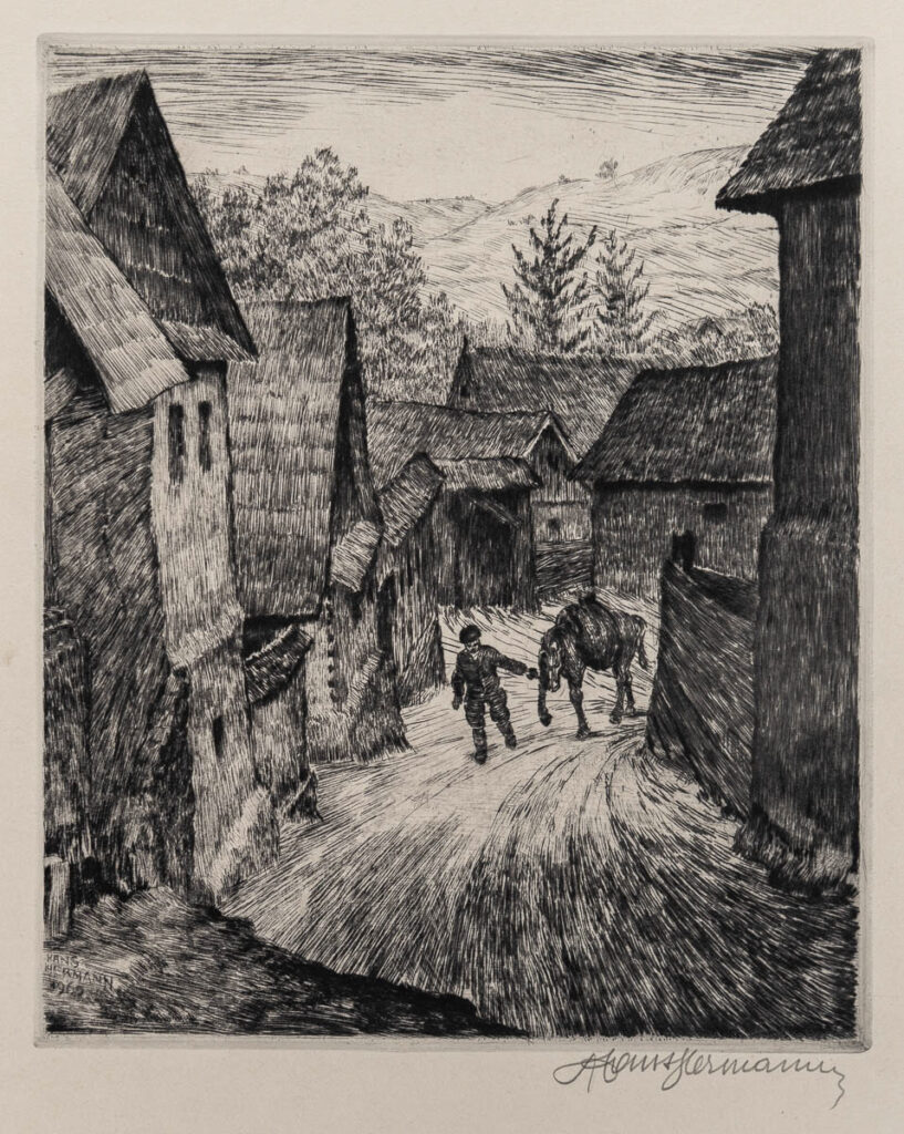 Gravură cu acul; 24.06×30 cm; 1969; Nr. inv. 987 Compoziţie verticală înfăţişând o uliţă îngustă,mărginită de case modeste şi înghesuite,pe care se vede un ţăran ce duce un cal de căpăstru.Dincolo de case,în plan îndepărtat se zăresc câţiva copaci iar în fundal culmile unor dealuri.Pespectivă liniară şi aeriană.