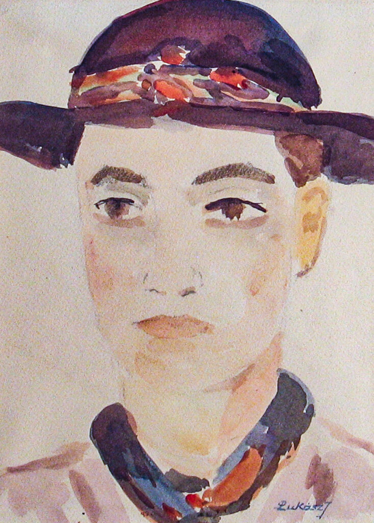 Acuarelă pe hârtie; 21×26 cm; cca. 1950-1960; Nr. inv. 3689 Compoziție pe verticală reprezentând portretul-bust din semiprofil-stânga al unui tânăr îmbrăcat în costum popular și care poartă pe cap o pălărie neagră cu bandă decorativă bogat colorată. El are părul negru tuns scurt, ochi negri, privirea ușor spre stânga.