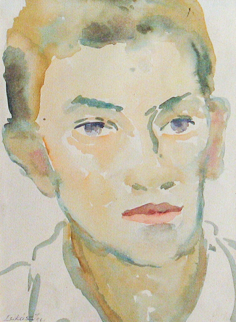 Acuarelă pe hârtie; 21×26 cm; cca. 1950-1960; Nr. inv. 3690 Compoziție pe verticală reprezentând portretul-bust al unui tânăr din semiprofil dreapta cu păr șaten tuns scurt, ochi albastru-închis, bărbie ascuțită și ușor proeminentă, poartă o cămașă albă.