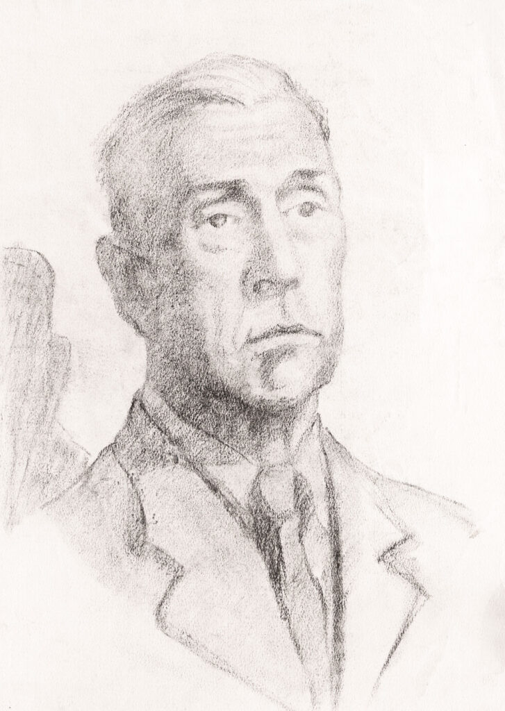 Compoziție pe verticală reprezentând portretul-bust din semiprofil dreapta al unui bărbat. El sre păr cărunt pieptănat pe spate, față sobră cu sprâncene subțiri, colțurile buzelor lăsate, poartă cămașă, cravată și sacou. În spatele său i se vede parțial umbra pe perete.